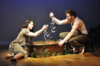 The Park is a newcomer to the London theatre scene: it first opened its doors in May 2013. This was my first visit and I was curious to see the venue. It was a hot summer evening and the street entrance had thrown open the windows and doors in welcome. You immediately step into the bar/café foyer which was light, airy and open plan with stairs at the rear leading to the two performance spaces (Park 200 and Park 90) and a further upper level bar. For those who would be dashing straight from work they serve soups and sandwiches which looked fresh and tasty.We were in the smaller Park 90 (seating capacity, yes you guessed, 90). Seating was in tiered rows but all on one level (ie. no circle/balcony) and wrapped around three sides of the stage floor. The arrangement allowed for an up close and personal performance which I imagine must be tough for the actors.