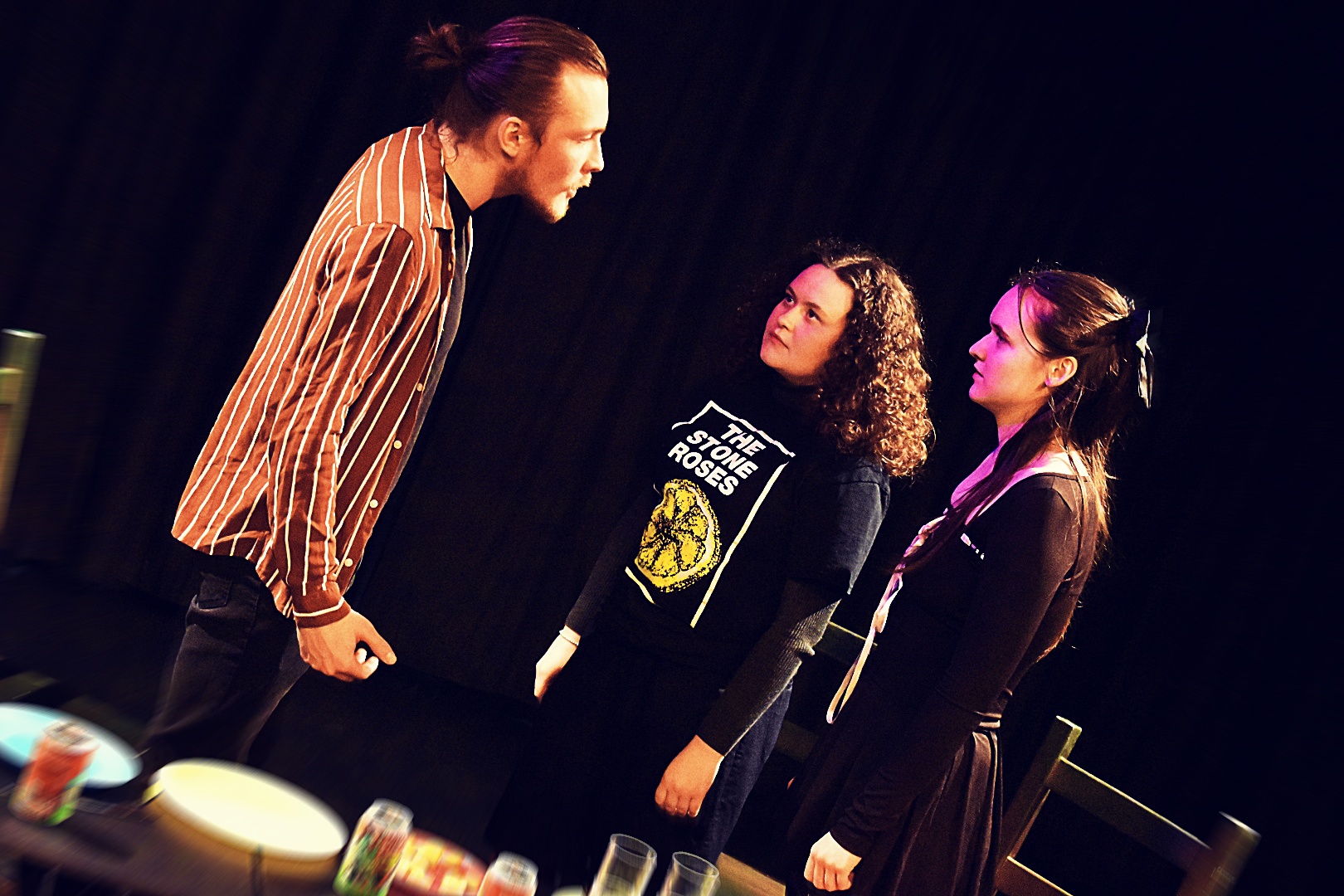 Olivia (Douglas) grapples with her sexual identity, Adam’s (Samuel Bell) fragile masculinity leaves him in denial of his actions, Elizabeth (Megan Lee) has issues with trust and, Jay (Viola Rizzardi Peñalosa) hoards a horrific secret. The play opens with the four characters standing in a row, alternately chanting common phrases women hear when being hit on or used to justify sexual harassment: ‘you look beautiful’, ‘are you alone?’, ‘she was asking for it’, ‘you’re a lesbian? I can change that’. Foreshadowing themes of gender roles, sexuality and harassment, the opening scene sets a sinister tone that grows throughout the production.
