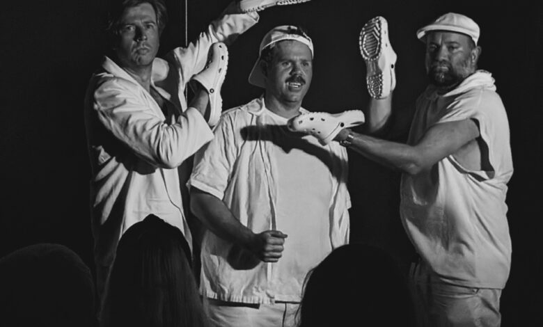 So the scene is set then for a glorious comedy piss-take of all things boy band; the clothes, the banter and the songs, the inane choreography and the clapping and the waving. Say hi to Jools Jacuzzi (Michael Kunze) Ray Jay Jay Jay (Fergus Shipman) and Hugh Way (Hugh Edwards); except unfortunately Hugh Way is indisposed and Away Way. But our brave twosome rejig the show and hold the fort. You gotta go with the flow. And in a way, that kind of not ultra-slick outfit, improvising along the way, fits well with the deliberate feel of this show. There were slight technical delays on the night, plus I got the impression that the excellent guitarist (Shipman) had lost his voice somewhat, not helped by trying to eat Jaffa Cakes at the same time – don’t ask!