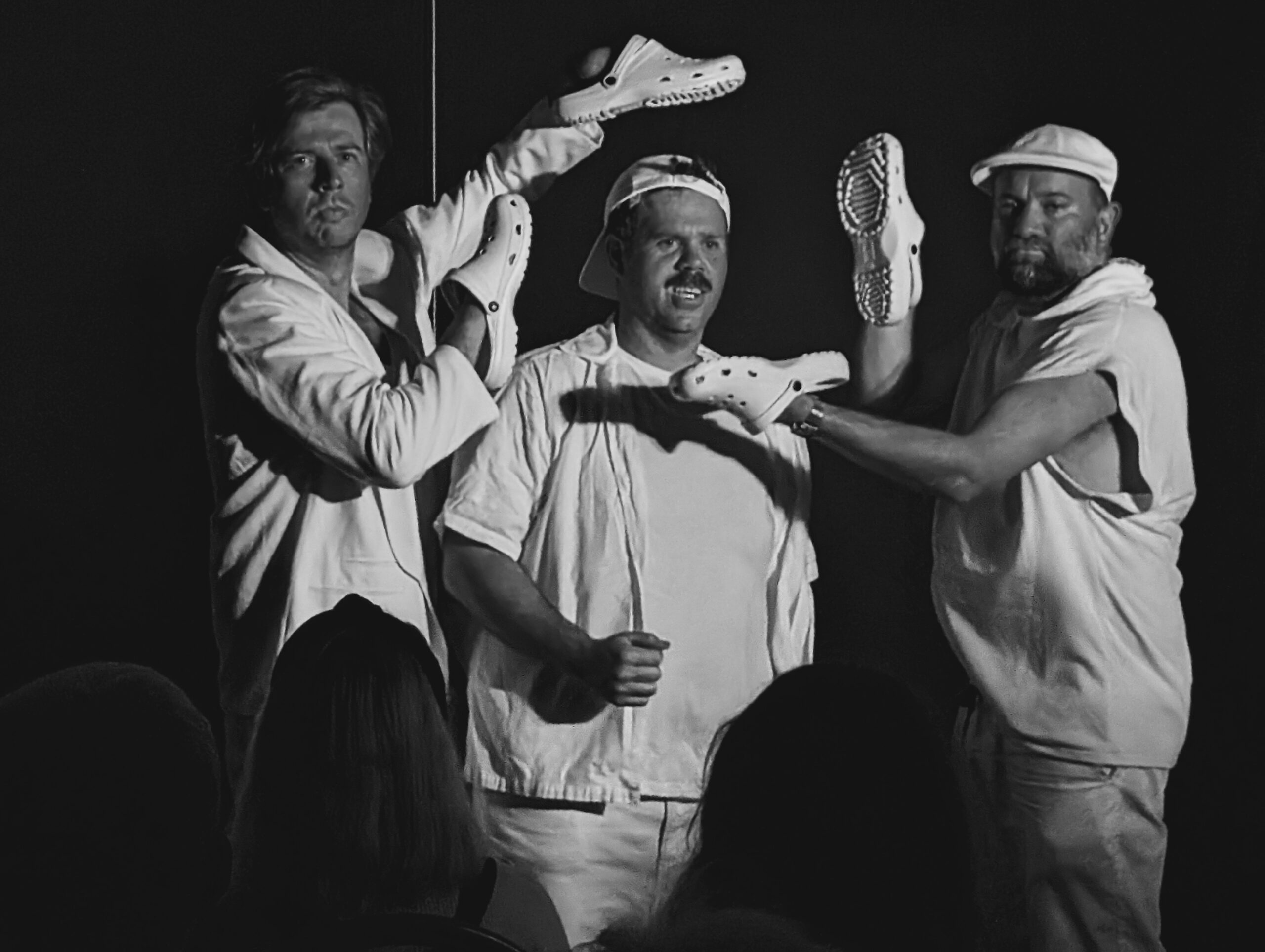 The alternative feel carries over to the show – a boy band reuniting, or just deluded in thinking they’re still young and sexy. I could say imagine East 17 with their edgy wide boy look (we’re definitely NOT talking Take That here). Or even perhaps, taking the lead from the accents, New Kids on the Block with sub rap boyz from da hood. Mmm NEW ?? I don’t think so, as we hilariously have late thirty-somethings who haven’t seen a gym for many years, yet who still strip down to their v-neck (very long V) t-shirts.