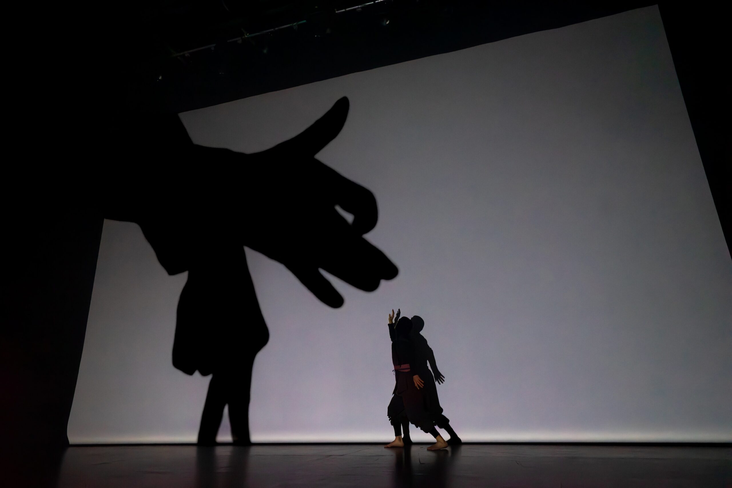 The piece then moves into its second phase, offering more obvious clarity and playfulness: we are moved, herdlike, to a cushioned seating area through two waving flags, to watch the shadow puppetry unfold. Animal shapes made by hands leap across the screens, and silks waft and swirl through the space, giving a welcome lift of dynamic action. Then the screens open up and the focus moves to a larger projection wall, where the scale and energy expand into something approaching the epic. Perspectives are cleverly exploited to bring much needed humour. As the shadows swell and distort, the audience are invited back onto the stage, their silhouettes becoming part of a glowing community – now colourful – as the white light is joined by vibrant beams. This is a highlight: a joyful finale to what has been a mysterious and sometimes confusing journey.