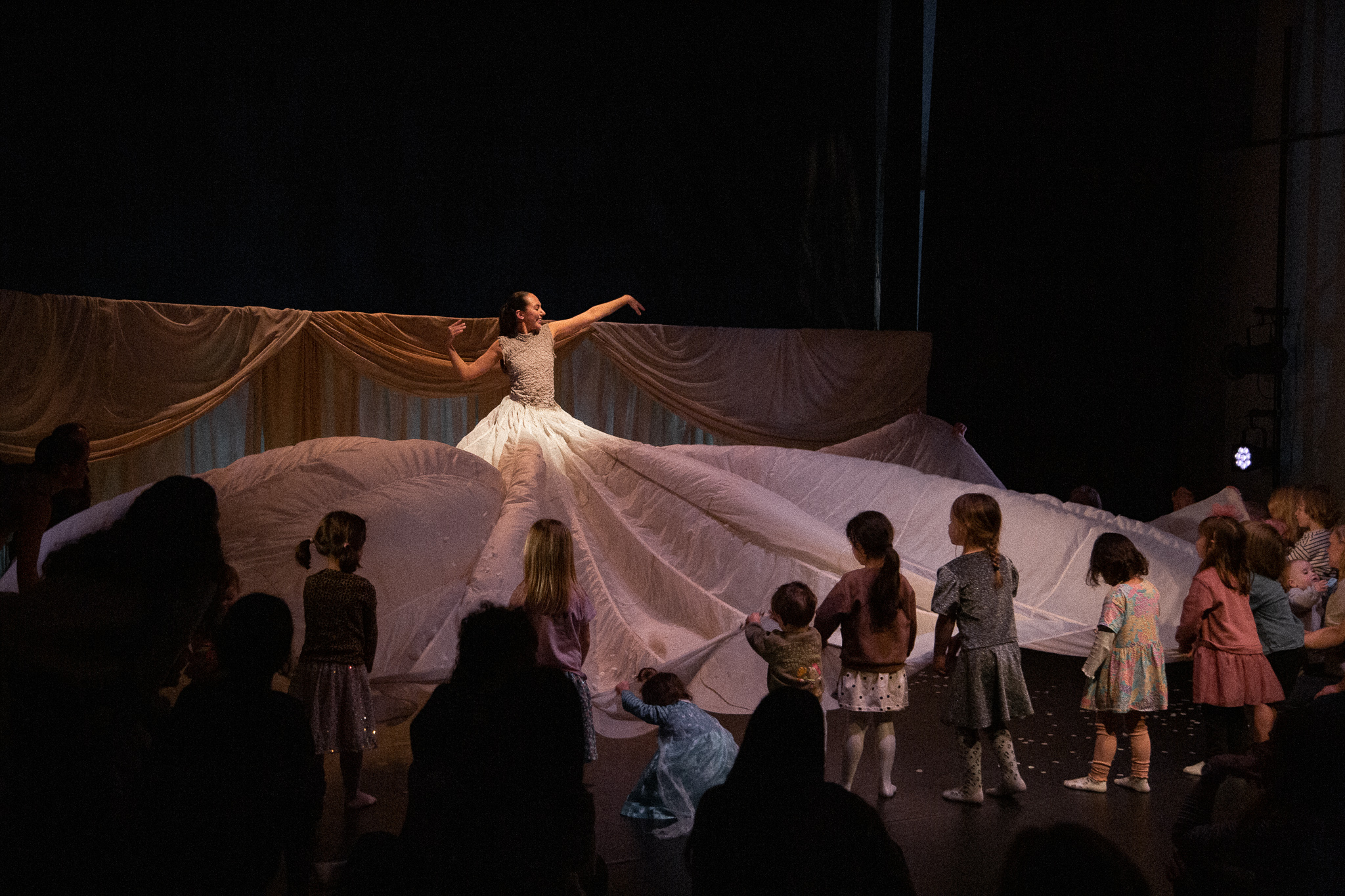 The highlight is a truly joyful spectacle where the draped set becomes the skirt of a statuesque goddess, blossoming into a huge parachute, which the children rush to play with and under. We’re then transported from day to night as the room becomes a starlit wonder. The performance just delivers and delivers and delivers, leaving everyone wide-eyed, amazed and moving together.