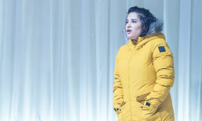 An outstanding ensemble (Miles Barrow, Harriet Gordon-Anderson, Ziggy Heath, Peyvand Sadeghian) bring impressive energy and emotion to the piece, working brilliantly and collaboratively throughout. Cast from a variety of backgrounds and heritages, they are representative of a planet that is diverse in culture and community. Each plays an extraordinary number of characters, switching seamlessly between them. It’s compelling storytelling and hugely exciting to watch, yet makes the difficult subject matter manageable. In this theatrical safe space, the characters offer familiarity, shared humanity and vulnerability and establish a global arena. Here together, we acknowledge and understand the many ways individuals struggle to cope with climate change now, and also envisage unimaginable futures.
