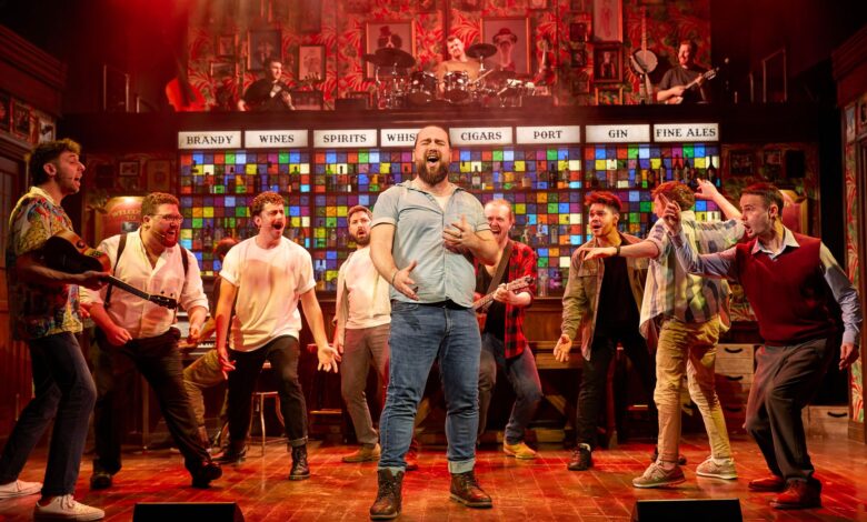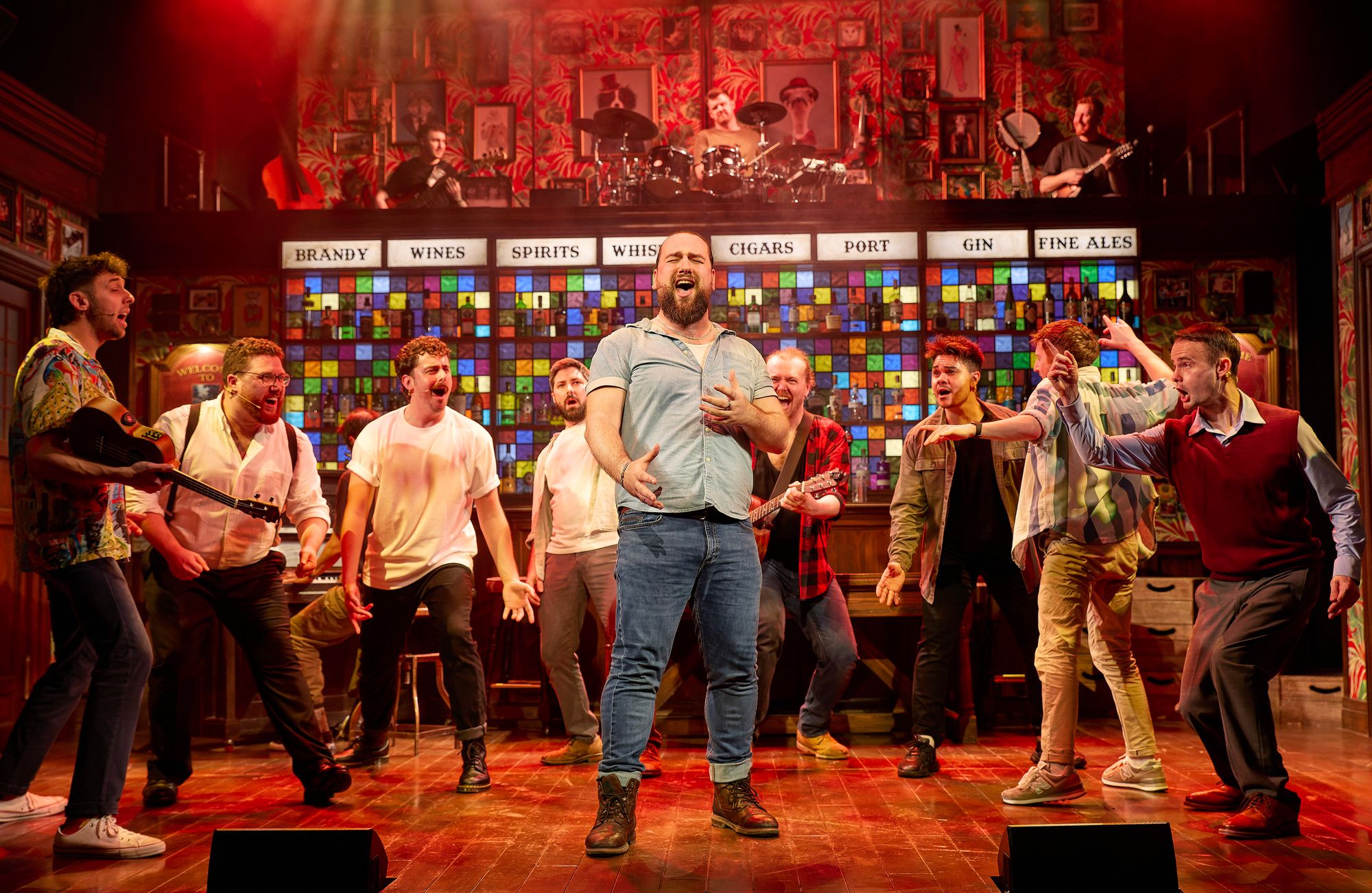 The premise is gloriously simple: nine men gather in a pub, sing their hearts out, pour pints for the audience, and share stories about friendship, identity, and belonging. The setting (‘The Jungle’) is beautifully realised – all scuffed wood, worn stools and working beer taps – and before the show even begins, audience members can head up on stage to get themselves a pint from the bar. It’s a lovely touch that adds to the atmosphere: we’re all drinking from the same pub. And in a theatre as compact as the Arts Theatre, it feels less like a West End musical and more like a big, cosy singalong at your local.