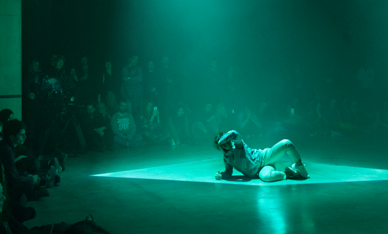 The Machine of Horizontal Dreams is a multi-sensory, multi-disciplinary performance played in the round, using light, sound, images, and movement. Four curved screens surround the space, and as we wait for the performers to arrive, a rumbling soundscape interspersed with an electrical sizzle envelops us, rising to a crescendo before dimming again. A number of images from the titular machine flash up interspersed with words that suggest a chapter break, such as ‘rest’ or ‘purging’.