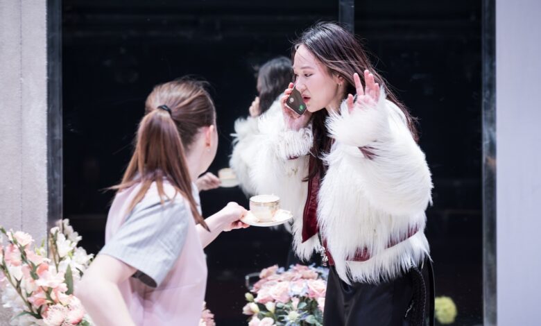 Williams updates Genet’s world to a modern, Gen Z aesthetic, infused with contemporary slang, Snapchat filters, and curated artificiality. This choice reflects the emptiness of the maids’ exchanges, mirroring the digital generation’s obsession with image over substance.