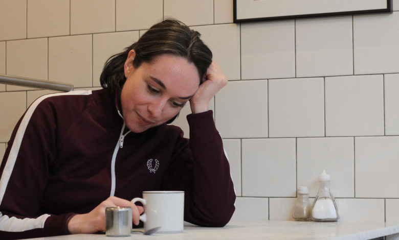 In a charming choice, Bentley constantly moves around the stage, directly addressing the audience to effortlessly build rapport, treating individuals as confidants by sharing little humorous asides and extra details within the story. To provide maximum space for movement, Worrall’s set design effectively provides a compact representation of the caff; a single table with chairs, a mug of tea and bottles of sauces. A subtle soundscape expands the scene with background chatter and the clanging of cutlery and crockery.