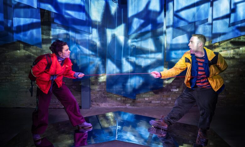 The set design by Cat Fuller neatly indicates a frozen landscape, with almost an icy seesaw at the centre, where it’s impossible to be stable. It’s enhanced by Hugo Dodsworth’s shifting, evocative lighting moving us between time and location, with digital projections suggesting the vast internet of data where our confused minds reap conflicting information about beliefs and truths. Jamie Lu’s clever sound design gives superb depth to the Antarctic atmosphere, with reverb on voices in the ice cave a highly effective choice.