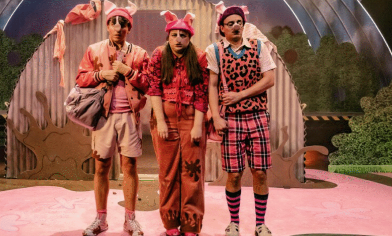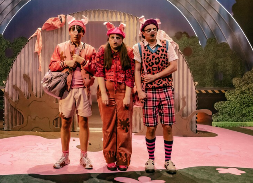 A big, bright set design by Emma Bailey sees a literal fried egg sun in the sky to match the bacon, as it shines over the pigsty where the pig family live. Space is becoming tight, and it’s time for the piglets to move out. Their dad was eaten by a Big Bad Wolf, so Mum warns them to take care out in the big world… Good advice indeed, and we know what’s to come!