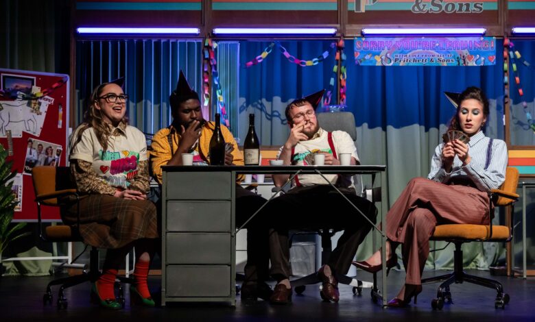 Set in an office on the day of a leaving party in the beige, brown and orange 1970s, the story follows the complex secrets, alliances, betrayals and discoveries of four co-workers, conveyed through extracts beautifully stitched together by Scottish Opera’s Head of Music Fiona MacSherry, Director Emma Doherty and Designer Kenneth MacLeod. Onstage relationships grow progressively more frenetic as the colleagues’ professional masks slip through the course of the day and into the leaving party itself.