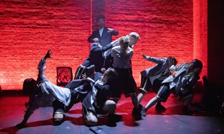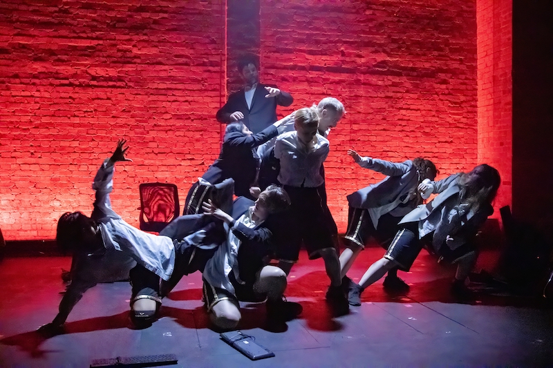 With such frequent and fast-paced transitions, Marina Ambrosone’s costume design uses an inventive modular approach to enable the cast to seamlessly switch out the different elements of their attire. When portraying the Romans, they wear gleaming white tunics which hang low enough to largely conceal their black trousers and skirts. Tucking in the tunics whilst donning black or grey blazers quickly transforms them into the modern office workers. To depict the rats, the lights cut out completely, the blazers are buttoned up to blend their bodies into the darkness, and red torches are held up to represent the eyes. These rats are endearingly brought to life by the ensemble athletically scurrying across the stage, angling the torches and producing a variety of squeaking and gibberish sounds to impressively and clearly convey a range of emotions from fear, sadness and aggression.