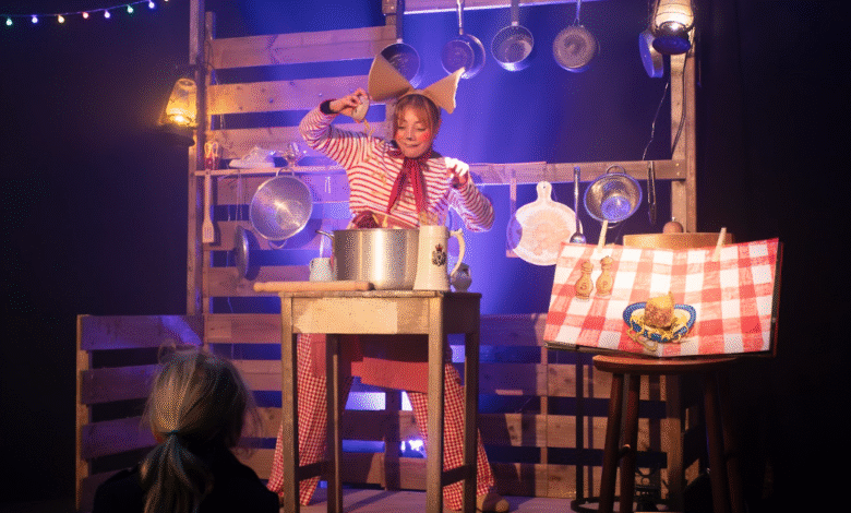 The first character we meet is Revolutionary Rabbit (Jack Reilly), bold, loving his blingy shiny suit, and wonderfully forthright about how we should behave and where our loyalties must lie. From there, we move to Pigeon’s charity-shop emporium (played by Louise Mellor) – a space celebrating recycling, reuse, and the hidden histories behind well-loved objects – before arriving at a woodland kitchen, complete with campfire glow, hosted by Mouse (Oriana Charles).