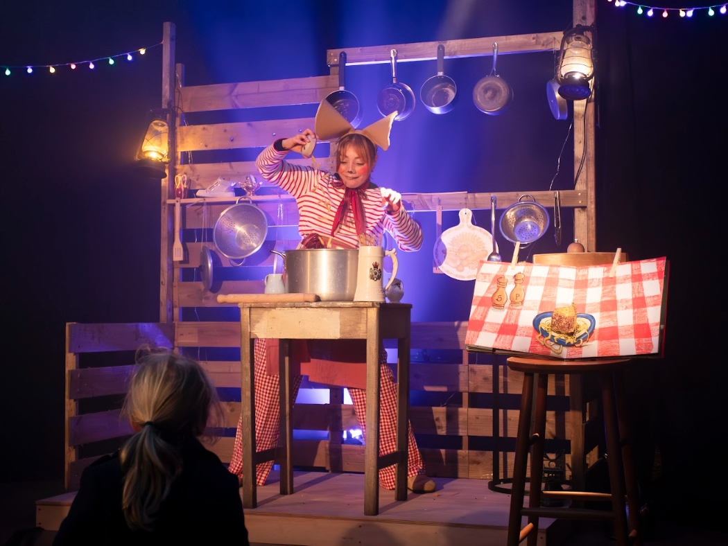 The first character we meet is Revolutionary Rabbit (Jack Reilly), bold, loving his blingy shiny suit, and wonderfully forthright about how we should behave and where our loyalties must lie. From there, we move to Pigeon’s charity-shop emporium (played by Louise Mellor) – a space celebrating recycling, reuse, and the hidden histories behind well-loved objects – before arriving at a woodland kitchen, complete with campfire glow, hosted by Mouse (Oriana Charles).