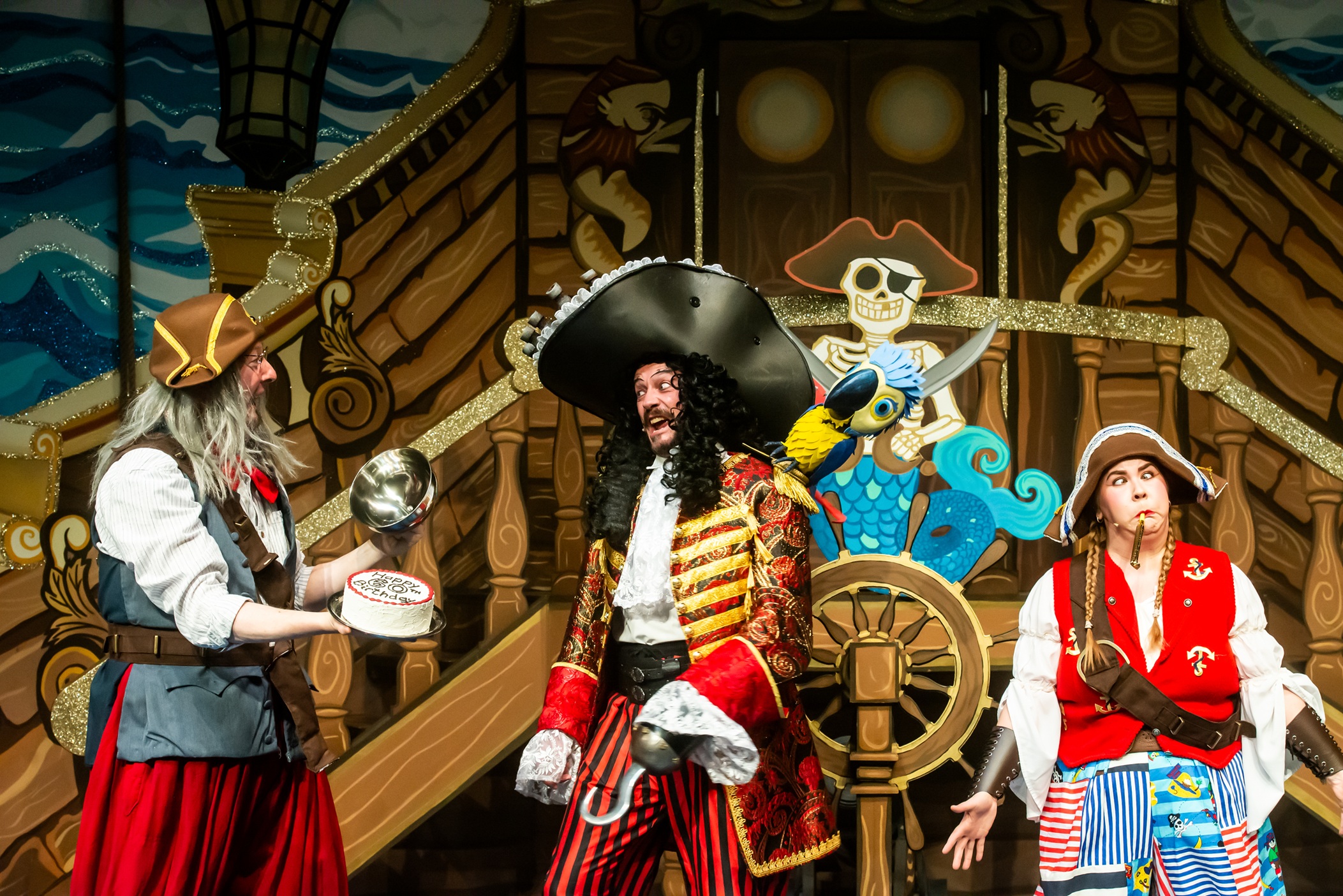 The production benefits from Greenwich’s revolving stage which allows for slick, quick set-shifting between Neverland and Hook’s ship, with the two main sets back-to-back in the traditional style. This means in the first act in particular the energy is consistently high, with short punchy scenes that switch between the two locations, ensuring it very rarely ever drags. The plot is largely irrelevant (secret amulets and fountains of youth don’t hold much water) and is cursorily meted out, but somehow between songs, set-piece gags and excellent performances – complete with two live musicians who occasionally also join the crew – it’s just wave after wave of great panto feeling. There is a deft balance between hitting all of the panto beats, but with it being so well-knitted together the flow isn’t broken when it does stop to do a ‘bit’.