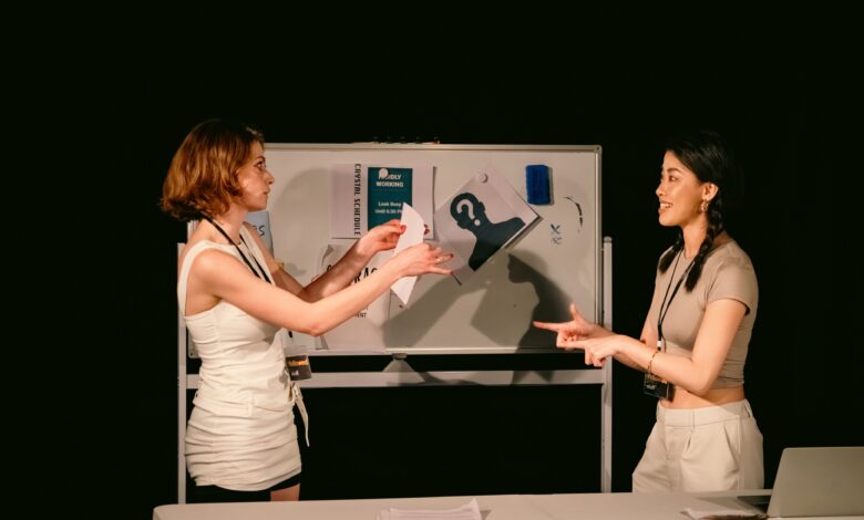 Aubergines and lube become props that locate us in the adult film industry, paired with an office setting filled with whiteboards, desks and lanyards. Props are used hilariously for bits of physical comedy. Feind as the film star performs a hilarious bit of physical comedy with Zhou, using the aubergine as an euphemism that elicits laughter from the audience. Moments of Jade breaking the fourth wall are also implemented well, whether it’s handing out CVs to the audience or performing monologues that provide insight into her characterisation.