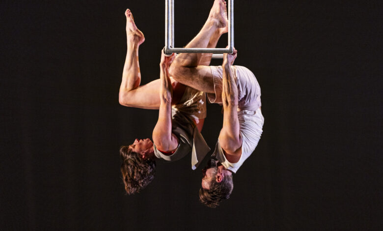 Despite the company’s reputation, much of the action is floor-based, blurring the lines between circus and dance. Suits me. Harvey and Mooney are using their bodies to tell their story. Let others define it. The pair aren’t scared of standing still, though. We watch sand fall from the ceiling and pendulums swing along with them in welcome moments of reflection.