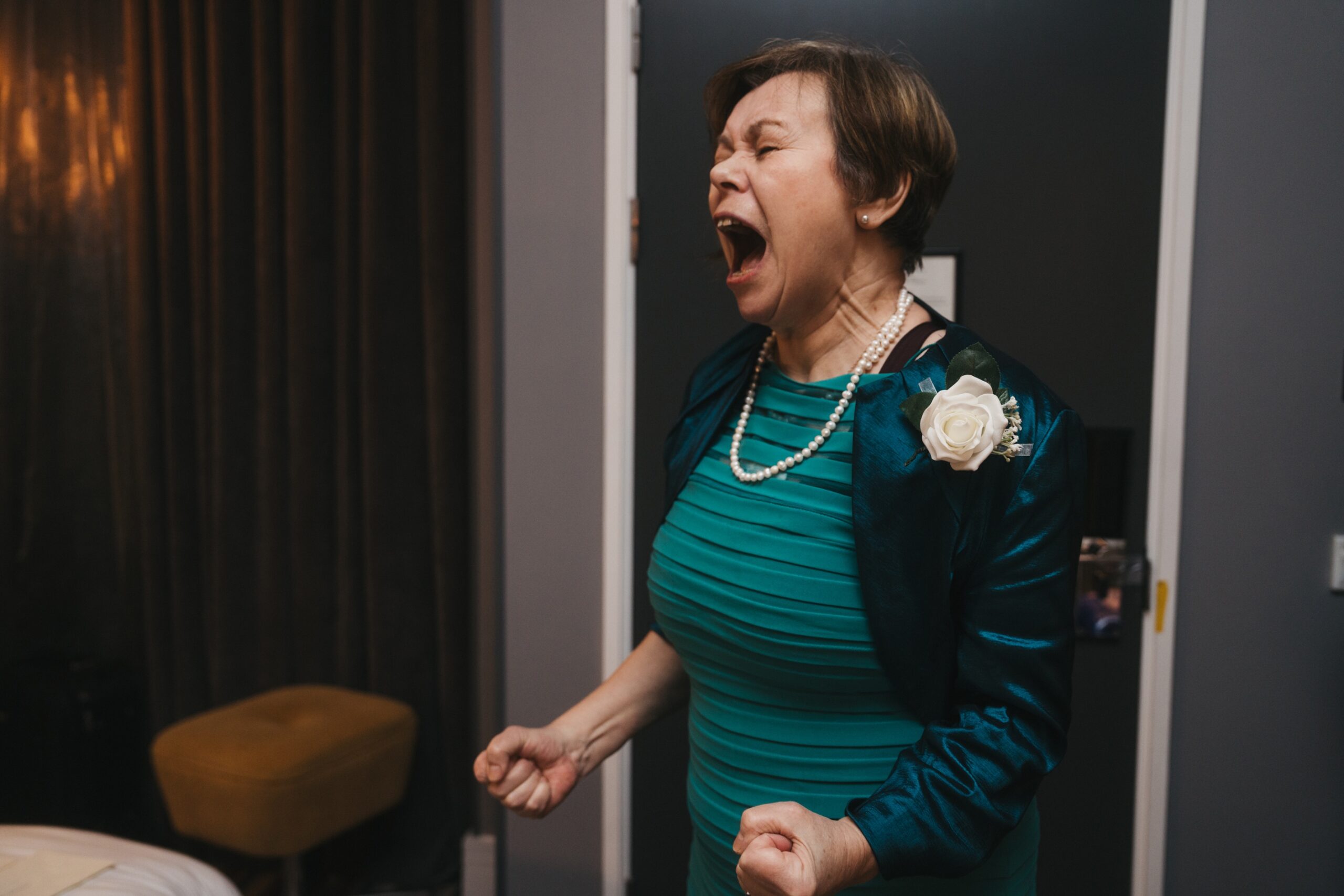 Split into small groups, audiences move between rooms where all the classic wedding tropes are happening in tandem. Praise must go to the promenade hosts, who skilfully hold their groups together with clear instructions, allowing them to relax and enjoy the thirteen-minute encounters in each room as they navigate the six different journeys into pre-wedding chaos.