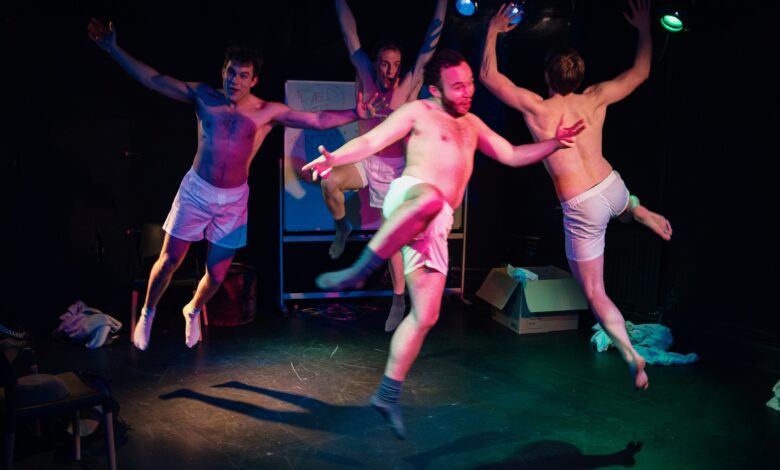 This experimentation provides a sampler menu of different genres of theatre, with director Will Merrick modulating the performances of the cast to provide each with its own distinct tone, often playfully exaggerating the stereotypes of the genre to great comic effect. Likewise, movement director Emily Orme has crafted a range of appropriately energetic or lethargic acrobatics, dances and movements for the cast to bring these styles to life. The unexpected opening scene is a brilliant statement of intent, as we watch a hilarious scene from low-budget sci-fi show Wolf Boys, which is a brilliant pastiche of campy, over the top 90โs childrenโs programmes like Power Rangers or Beetleborgs. The brightly coloured costumes handcrafted by the cast perfectly capture the spirit of the era.