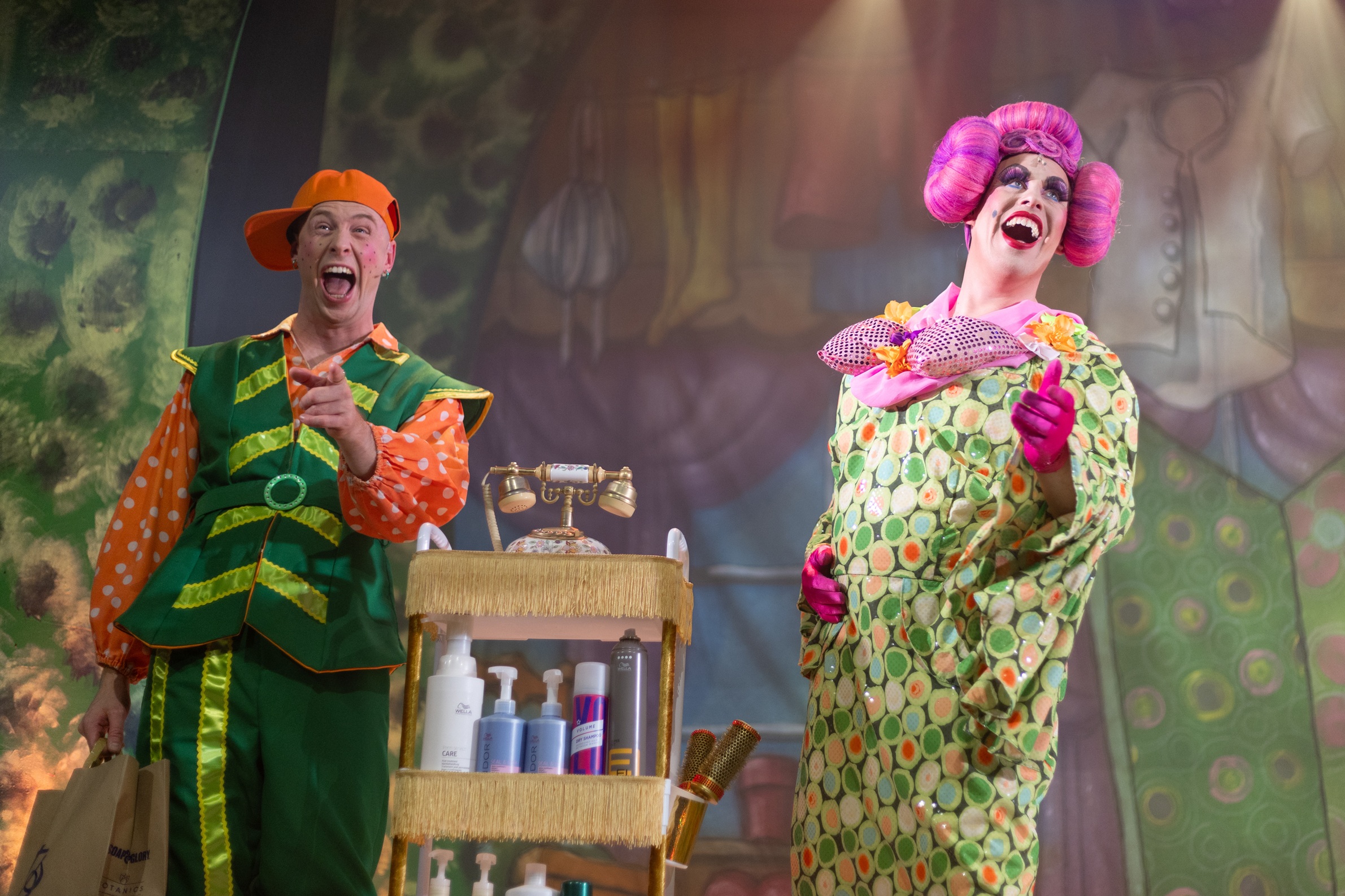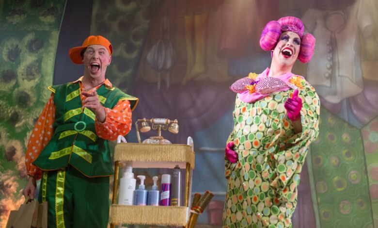 Rapunzel is loosely based on Disney’s Tangled. It tells the story of a princess with magical hair, abducted as a baby by a wicked witch, then locked in a tower. Everything is hair related; Dame Fanny Follicle runs a hair salon with her son Pascal, King Bouffant has a crush on Dame Fanny and goes for a haircut, where Fanny’s new haircut machine leaves him follically challenged.