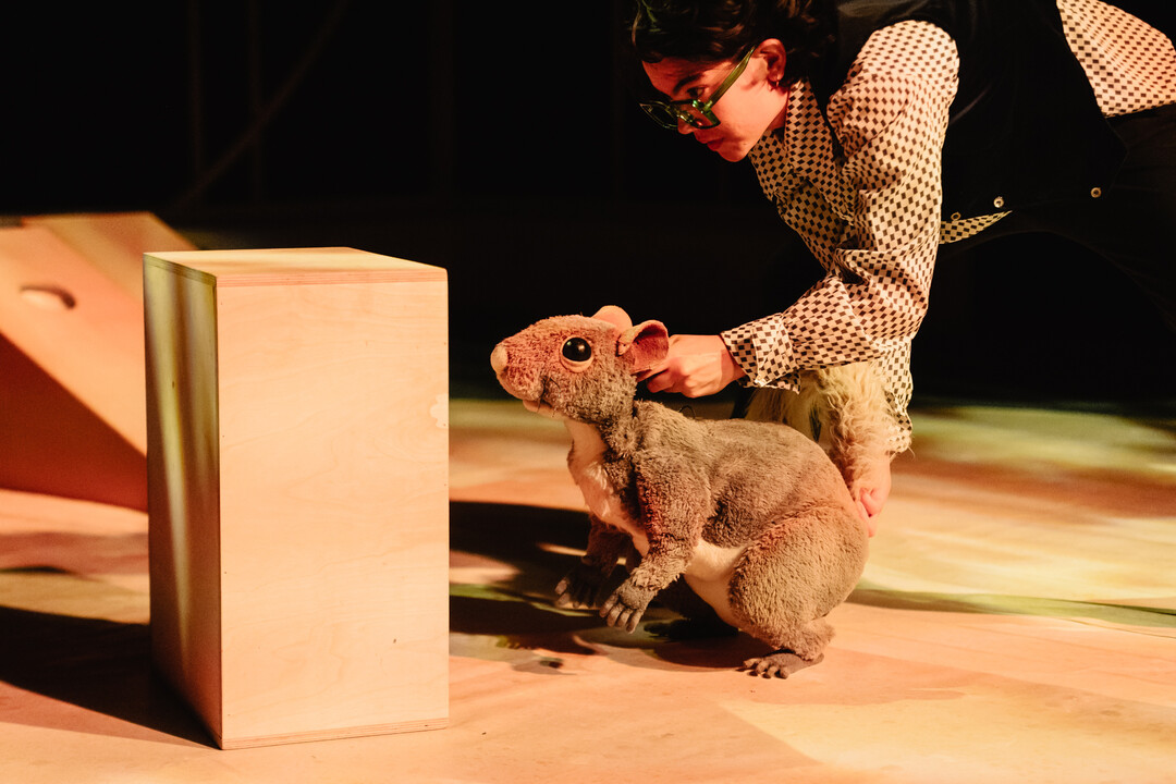 Our human protagonist – Mother Earth (Josie Dale-Jones) – speaks in fragments: broken sentences, gentle questions, little self-soothing reassurances – “it will be ok”, “let’s see”. She mirrors the growing excitement (and occasional apprehension) of the young audience as she tries to fathom the world she’s landed in. Dressed in a suit and tie, there’s something endearingly familiar about her – as if she’s just come home from a very long day at work and needs to unpack, reconstruct and eventually let go enough to play. Like the squirrel, she slowly sheds expectations and settles into curiosity. There’s something abstractly fascinating about this disjointed, understated approach.