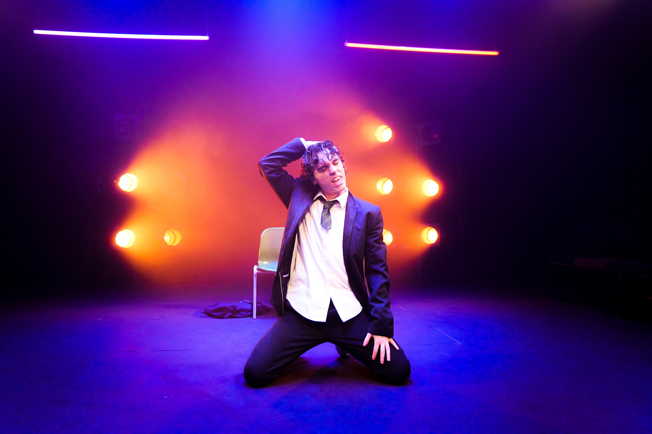 From the moment he enters he’s controlled, slick, connecting with the audience, as he struts the stage with teen swagger. He is a masterful storyteller, captivating from start to finish. Multiple colourful physical characterisations are laugh out loud funny, but are distilled, defined and paced to perfection by Scott Le Crass’s meticulous direction, vividly building the imagery of the teenage experience. There are some (admittedly utterly hilarious) cheap laughs about wanking and ugly girls – typical teenage boy jokes that verge on the unacceptable and have the audience open-mouthed – alongside stories of trying to impress peers, which ultimately go cringingly awry. But it becomes clear that Ollie’s bravado is illusory: it’s the armour of a desperately vulnerable boy in the bewildering space between childhood and adulthood who has no outlet or support for his emotional agony. The olive, initially representing a sweet nickname by his mum, becomes symbolic of the bitterness he’s consumed by and eventually his control collapses with devastating effect.