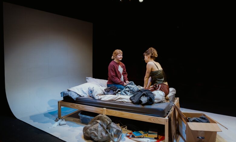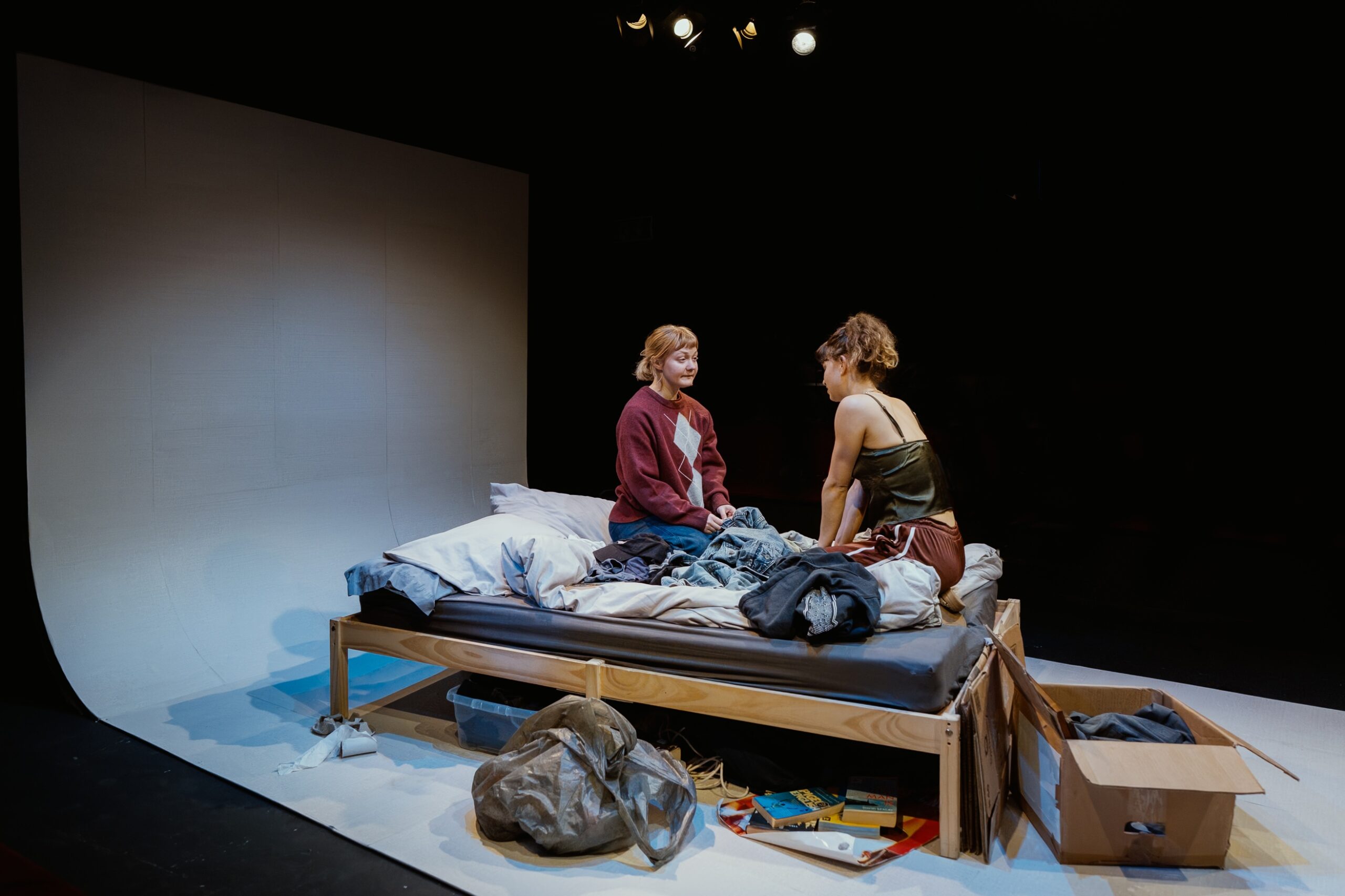 1:17am, or Until the Words Run Out follows Katie (Catherine Ashdown) as she reckons with her brother Charlie’s recent death, finding herself responsible for clearing out his bedroom. Mim Houghton’s set is stunning, placing Katie in a messy room that purposefully evokes Tracey Emin’s My Bed, a tribute to depression that makes a monument out of a mess. A house party rages above her, where Charlie’s former housemates, in some ways, celebrate his life on the last night of their flat share, while Katie holds a quiet vigil in resentful solitude. That fragile peace is disrupted by the arrival of Roni (Eileen Duffy), Katie’s former best friend.