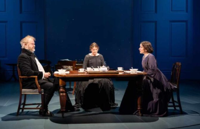 It’s a challenge to portray a whole house on a stage, but the designer Sarah Beaton manages well with the help of a revolving stage, segmenting off rooms to corners or clusters of furniture. The staging rather fades into the background apart from a huge light box at the back, framed by enormous Victorian shutters, which is an effective and dramatic focal point. It is used brilliantly at the end of the first half when snow from a blizzard enters the house.