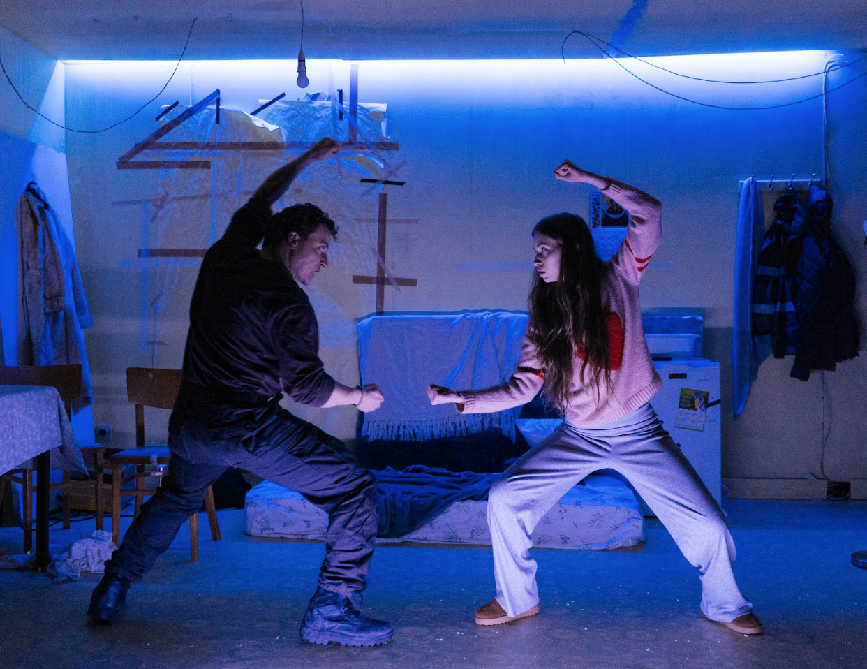 Niall McKeever’s set design sees a space held together with parcel tape; there are holes in the ceiling, the refrigerator is bare, and, in many ways, it reflects the fragility of its inhabitants. Noises of war intrude invasively as Russian aggressors traverse the town, and snipers sit patiently waiting to pick off their neighbours. We meet a family both fragmented and held together by circumstance. Sashko (Jack Bandeira) returns home after detention by the Russians for rebellious behaviour and finds Marianca (Sasha Syzonenko) has moved in with his father (Philippe Spall). Fleeing troubles in Moldova, Marianca has become entrenched in worse here. Sashko’s sister Nadya (Ksenia Devriendt) is so traumatised after their mother’s disappearance she is initially non-verbal. She’s supported by her grandmother, Vera, played beautifully by Liz Kettle, and Vera’s ethnic Russian companion Ivan (Steve Watts).