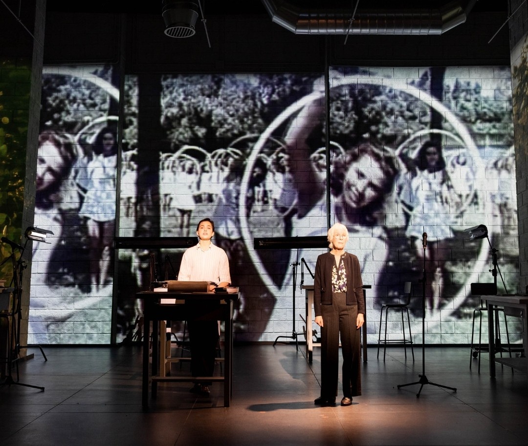 We meet three main sets of characters — the archivists, led by Rebecca Erbelding (Philippine Velge), the people who feature in the photos, and their relatives. Often it is the people in the photos who take centre stage — their faces filling the back of the theatre, spilling across the proscenium arch, and repeated in smaller panels across the stage. Video is used to highlight individuals in the crowd shots or isolate them as they stand proudly in a group shot. We follow the archivists as they try to name the Nazis and find out what happened to them. Velge brilliantly conveys the nervous energy of the archivist, the horrified excitement of her discoveries and her mission to uncover the truths that will hopefully bring about some much delayed justice.