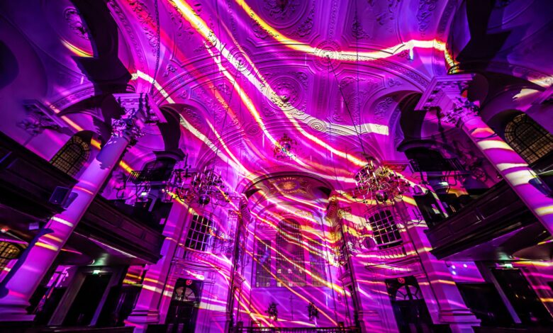 The installation layout includes the exterior walls of the iconic St Martin-in-the-Fields’ courtyard, its crypt and main church. In fact, Space began as I waited in the queue to enter the courtyard – a sign the night was oversold, or perhaps an intentional choice to build anticipation. I stood for about fifteen minutes, watching two kaleidoscopic patterns flicker on the great stone façades.