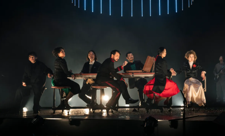 Kyoto company Chiten Theatre‘s adaptation uses a ‘collage’ method to reimagine the story and enact the creative world of the playwright. The original text is fragmented and stripped down to short passages as it is performed in looping segments, with live music augmenting the sound of the spoken words. Alongside this disruption, the performance is in Japanese with English surtitles screened at points around the stage. The whole is challenging, particularly in translation for a UK audience.