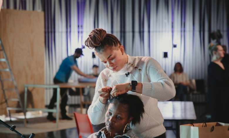 The “performers” are equally spaced throughout their “stage”. Most work from a table. When I was there, we watched a portrait painter with a live model, a butcher, a hairdresser, and a decorator and listened to an embalmer. A compere and interviewer moves between stations to ask questions that appear on a screen at the back of the space, as well as gently enquiring as to the nature of the work that is being completed and the person doing the work.