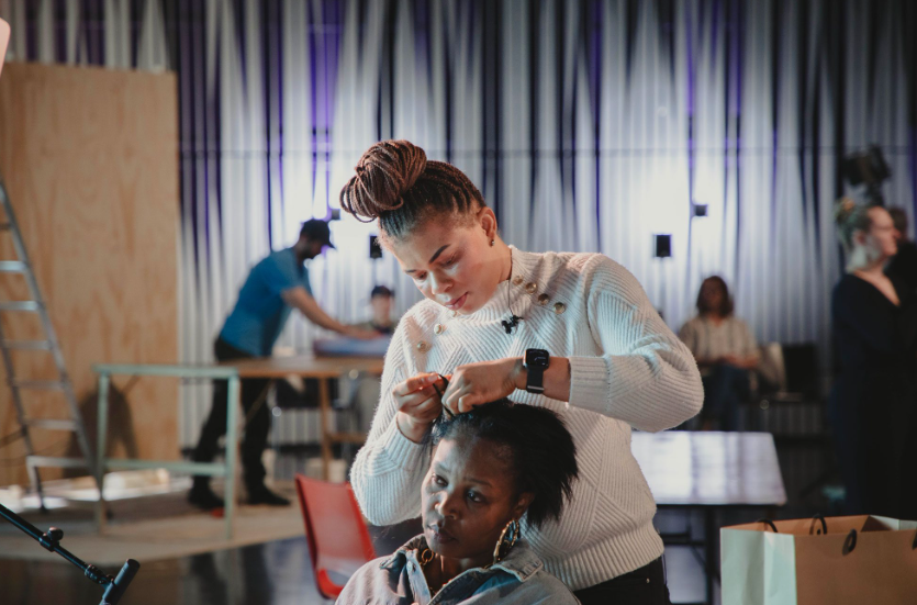And then in comes Beryl. An older Caribbean lady, she cooks for very large events and is about to turn the chicken recently deboned by the butcher into a tasty Caribbean curry for a large wake post-funeral. She pauses midway between off-stage seat to table and calls out for some support from the audience: “Come on”, she cries, “I’m nervous … I don’t normally do things like this!” and the audience responds as one with genuine fondness and laughter: “We’re here”, we mean, “We’re all one community”.