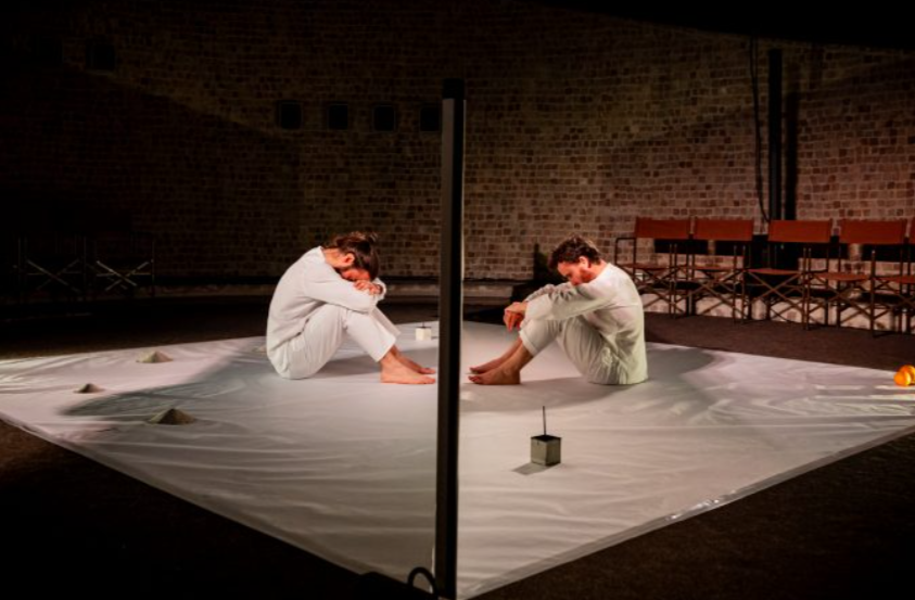 Over 50 minutes, and initially in complete silence, we meet two unnamed characters, delicately and truthfully portrayed by Giuseppe Palesciano and Ettore Chiummo. They go about their day-to-day routines on either side of a low white paper screen, a ‘wall’ that cuts diagonally across the clean white square of playing space, with the audience watching while seated in the round. Since they are also dressed entirely in white, the only thing that breaks the visual tranquillity of their worlds is the shifting texture of shadows they respectively cast onto the paper screen. As an audience, we share their individual play routines. But depending on which side of the ‘wall’ you are sitting, the activity on the other side remains indistinct, which of course is entirely the point.