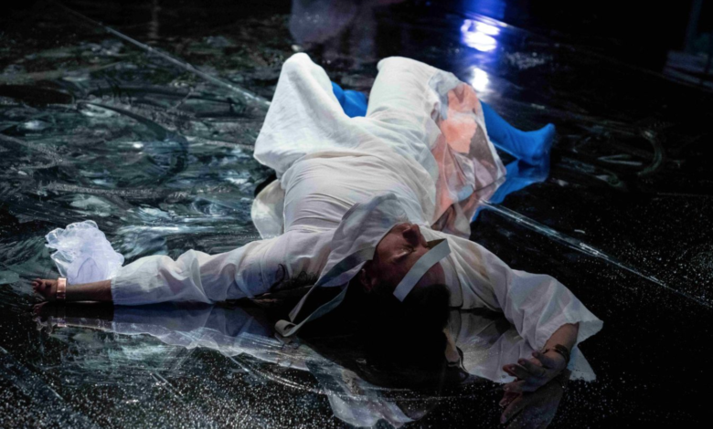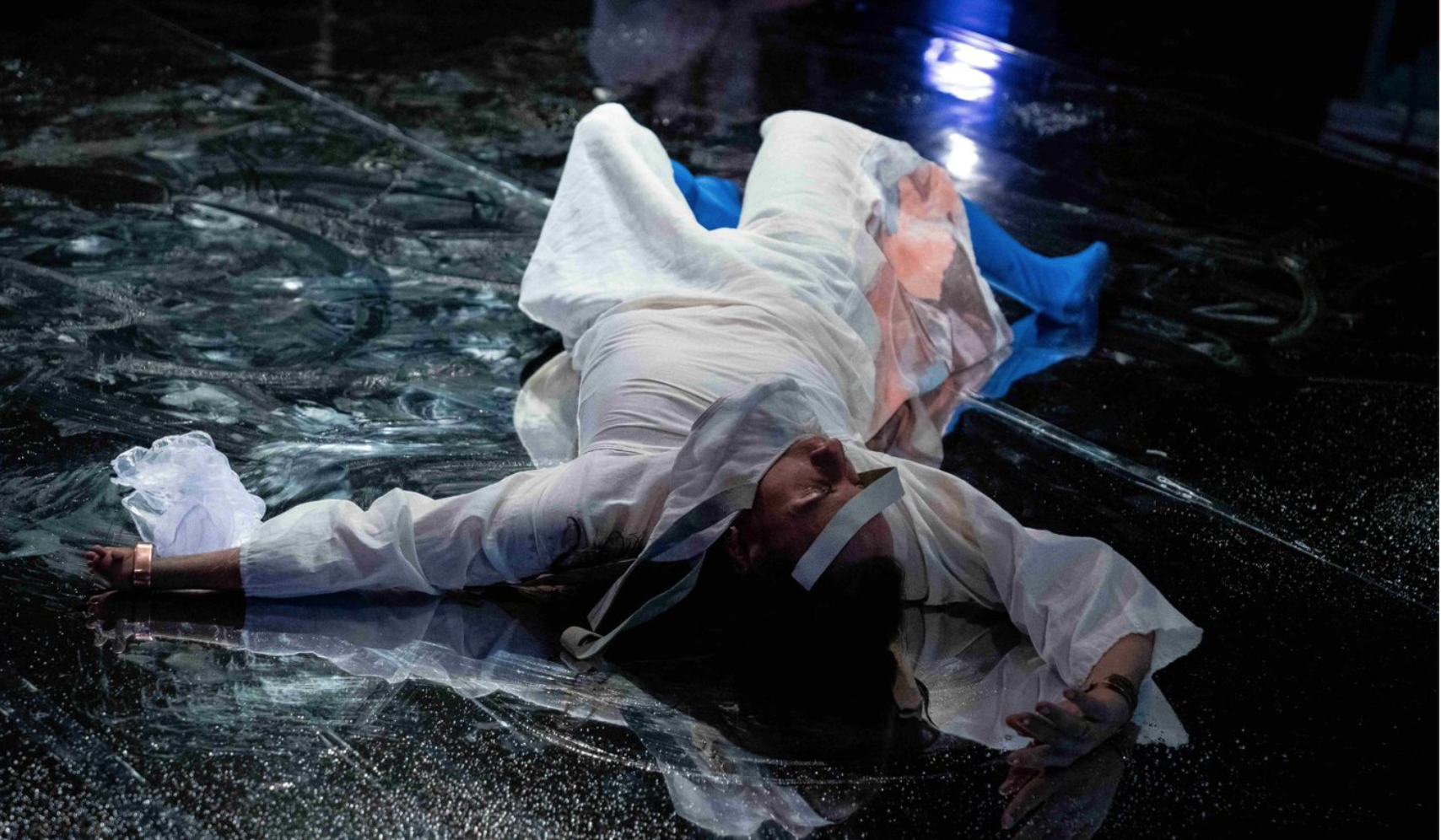 The set design, by Rūta Irbīte and Alexandrina Yewande Hemsley, is mesmerising. The reflective floor creates rippling, aquatic effects that make motifs of swimming and floating feel visceral rather than metaphorical. As performers move, their mirrored doubles move beneath them, making the underworld visible. The reflections ripple across the back wall, amplifying the sense of submersion. Above, the linen canopy – fabric that was literally buried and then unearthed – functions as both shroud and sky. Throughout the piece, melting ice drips through the canopy’s fibres, each drop marking time, transformation and dissolution. This is the installation’s standout element: the water slowly seeping through a burial cloth. As an audience member, I longed for the performance to surrender more fully to this element’s dramaturgy.