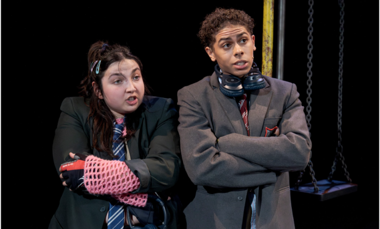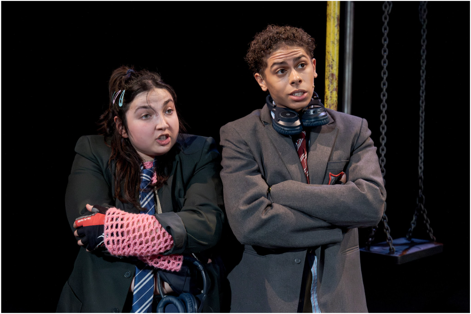 The set uses modular boxes effectively, shifting them to form different scenes, while a partial climbing frame and swing set make a striking centre piece, echoing both childhood play and the precarious balancing act of growing up. The original grime-infused sound, created in collaboration with MC and producer Jammz, vibrates through the audience, drawing them in and rooting the piece in rhythm, movement and lived experience. It doesn’t just underscore the action but pulses through it, shaping the tempo of the performances and reinforcing the emotional beats of the story. At times it feels almost intrusive, a reminder of the constant noise these characters are navigating, both internally and externally.