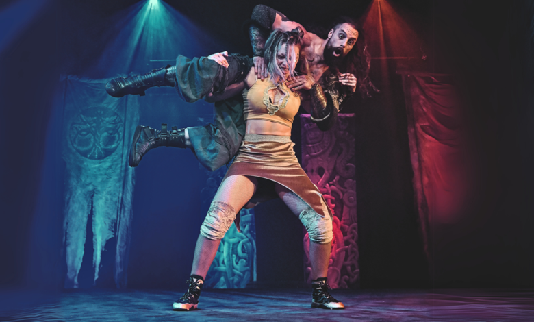 Kjell Braaten’s atmospheric sound design perfectly captures this blended approach of historical and modern, switching from slower vocals with drums during the worldbuilding speeches, to a fast-paced rock style during the combat. Whilst most of the action takes place in the wrestling ring, there is an extended backing set where Melanie Watson’s detailed design enhances the distinct visuals of the different realms. Likewise, Watsons’s impressively intricate costume designs for the armours, robes and cloaks of the Norse heritage incorporate similarities of motifs for the inhabitants from the ice and fire realms, whilst also reflecting the preferences of the different personalities. Practically, the costumes are impressively sturdy to hold up against the frequent impacts against the ring.