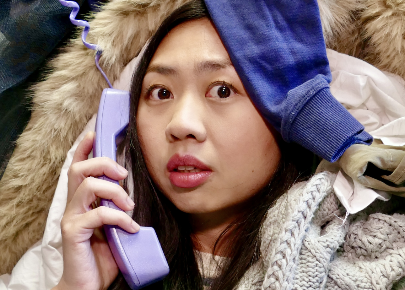 The Space is quite a roomy venue, and Renae Lau fills it with her larger-than-life performance and undeniable charm and wit. Immediately upon entering, it felt like being in a little world of Renae Lau’s own making, intensifying as the show unfolds (and as she overcame the nerves that were present in the first 5-10 minutes). Various items of clothing, pages of writing revealed to be prayers, and a telephone. This is not just any telephone, but a hotline straight to God, with an auto attendant voiceover, from Anna McManus, listing the extensions to various deities – earning some fantastic reactions from Renae Lau. The lines are suspended above the audience and a mountainous pile of clothes, which are not only her mother’s but Sophie’s emotional baggage, too.