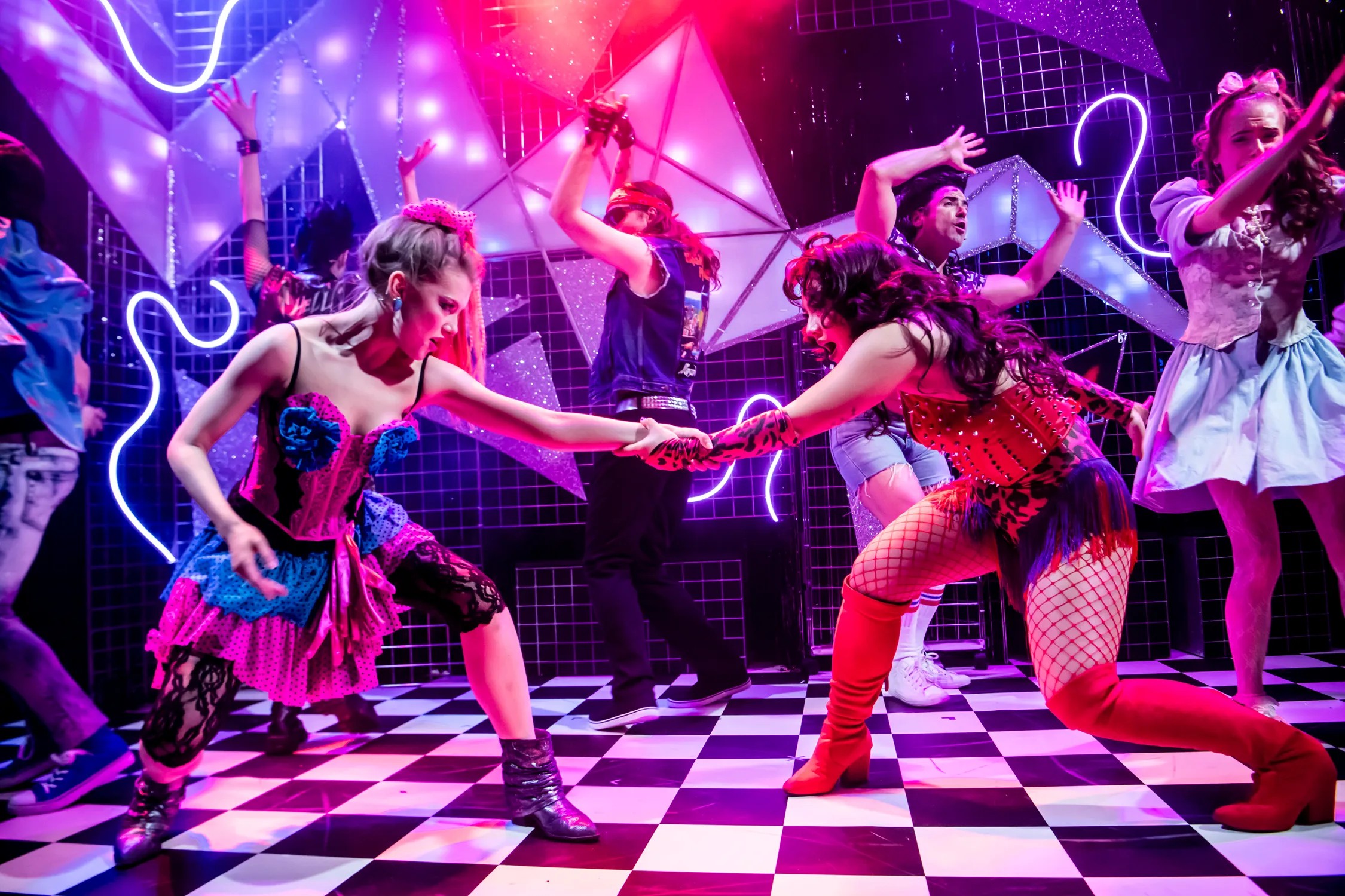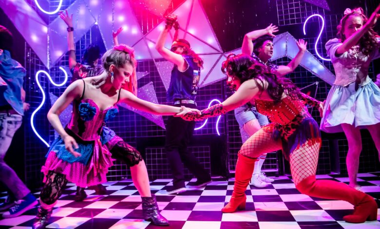 The story of Nancy’s brief stint as Satan’s handmaiden is told against a backdrop of neon lights and geometric shapes, on the small stage of the studio at The Other Palace. Members of the cast flip these geometric shapes to show place names and move us from school hall to video shop to grungy bar. Given the constraints of the space it’s an efficient approach, but there isn’t much sense of being in different locations. Costume Designer Juda Leah has more room for manoeuvre and has fun. All the 80s hits are here, including lacy tights, ra-ra skirts, ankle boots and crimping. Nancy’s she-devil outfit, featuring studded corset, red fishnets and flame-coloured tassels is a highlight, while the devil’s spiked jockstrap is also memorable.