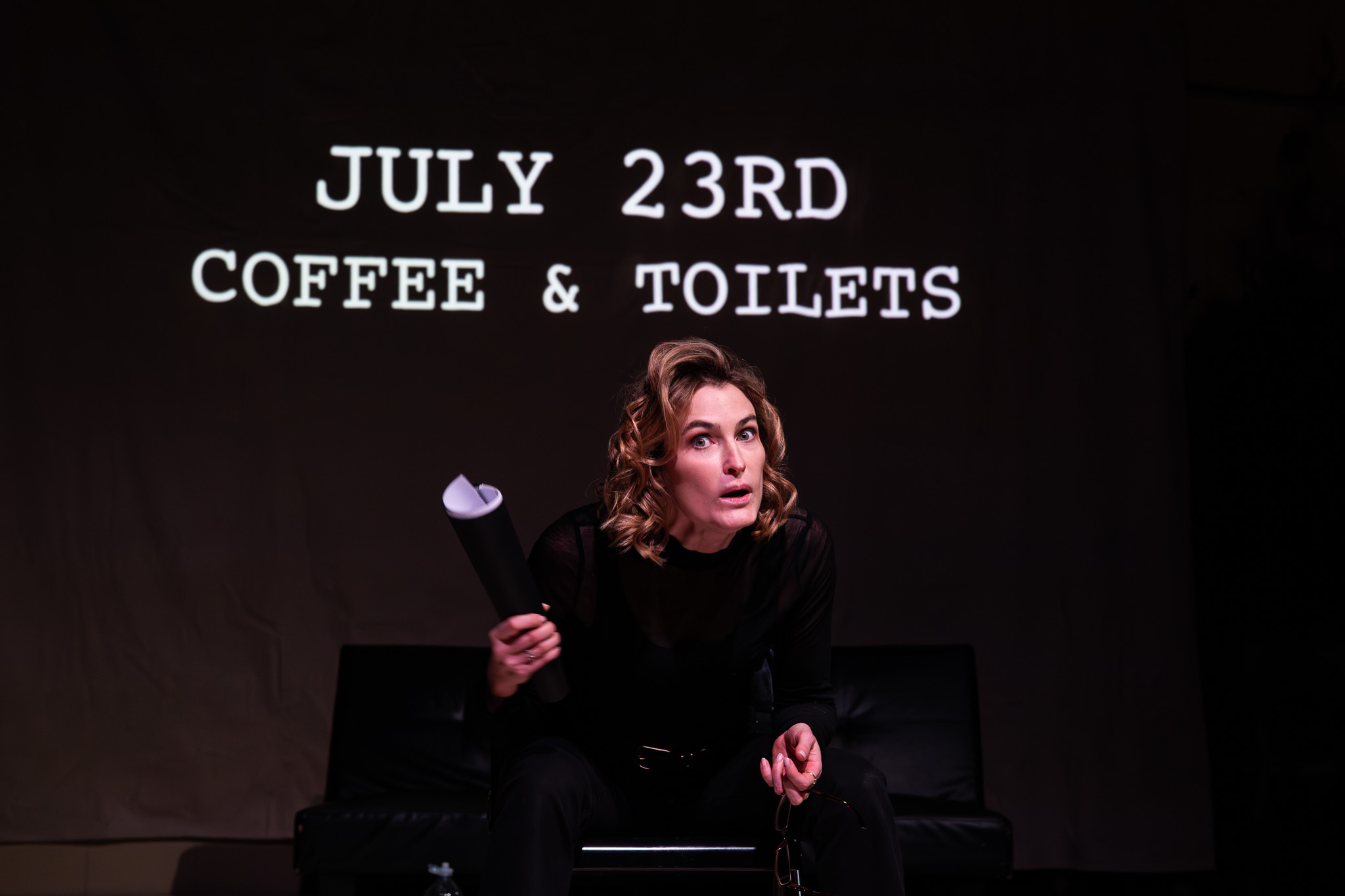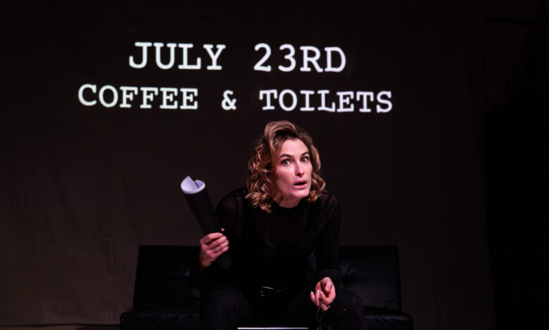 Laura Kay Bailey then strides to sit centre stage, facing out to speak to the audience who represent a variety of characters for her to bounce off of. Confident, attractive and powerful, she moves between personas, accents and time to demonstrate her life to date and continued desire for an acting job despite decades struggling for success. WhatsApp makes several more on-screen appearances to represent off-stage conversations.