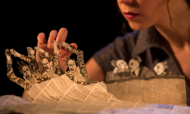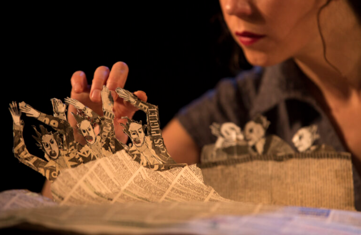 As we watch, Trouvé not only recounts the news aloud but also releases the broadsheet’s stories, tearing holes in the fabric of the paper world to allow tiny characters to pop up, which she then voices in a vibrant and charismatic performance. It’s easy to get lost in the magical storytelling as she turns pages and propels us through diverse scenarios. Pulling surprising paper props from within the scenes, like Mary Poppins emptying her carpet bag, she mixes images, sounds and visuals intricately. We visit a room full of disputative politicians exclaiming familiar quotations from history and pop culture. There’s then drama as paper cars and their chatty passengers are involved in a shocking incident. Some of the scenes make us laugh before leaving us with challenging questions to think through: a chicken processing factory, themes of urban expansion, gambling, and a sinking ship that leaves a massive oil slick – clearly a reference to the ill-fated Concordia. There are dark moments here, but it’s captivating.