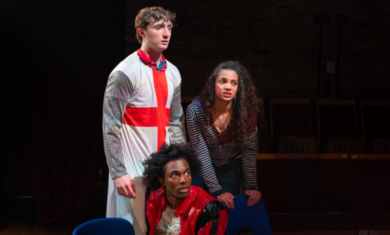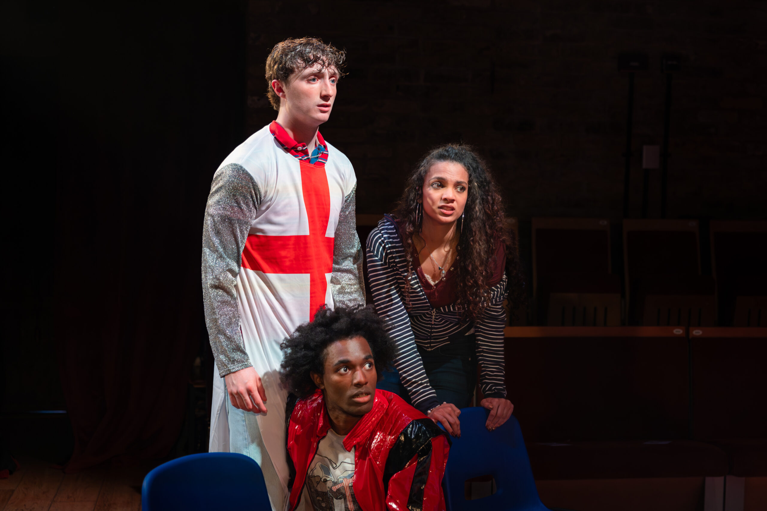 This fleshed out production has thoughtful set and costume by Maariyah SharJil, strengthening the characters with personalised, considered choices right down to the style of school bag each student owns. This helps build a time and a place beyond the four walls of the classroom the play is largely set in. The set is brought to life by the lighting choices of Rajiv Pattani, physically making the stage feel huge during the movement-heavy scene changes and lighting up a large scaffolding structure draped with stylised Union Flags, which physically cages the character of Fatima for the majority of the performance.